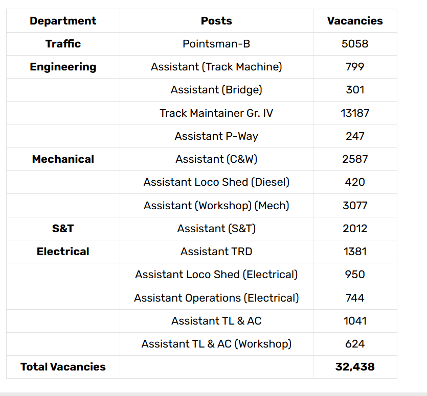 यहाँ 32,438 रिक्त पदों का विवरण दिया गया है: